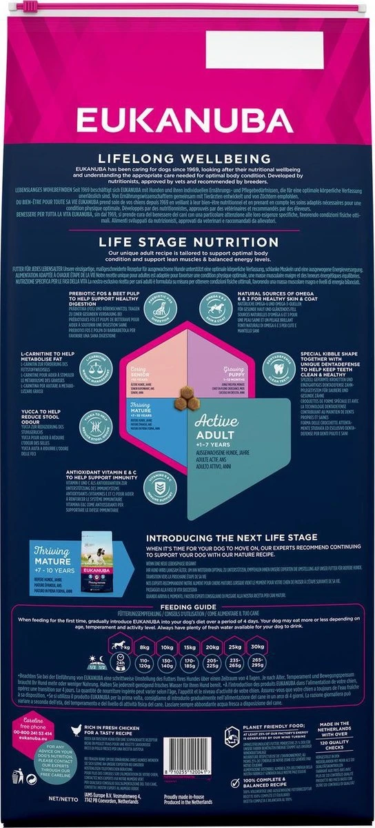Eukanuba’s beste hondenvoer voor volwassen middelgrote rassen, aanbevolen voor middelgrote honden zoals beagles, collies, cockerspaniëls en teckels. Eukanuba Adult droge hondenvoeding voor middelgrote rassen bevat prebiotica en bietenpulp, waarvan klinisch is bewezen dat ze de spijsvertering en een optimale opname van voedingsstoffen bevorderen. Ook bevat het antioxidanten waarvan klinisch bewezen is dat ze een sterke natuurlijke weerstand van uw hond bevorderen, en omega-6- en omega-3-vetzuren die goed zijn voor een gezonde huid en een glanzende vacht. Hoogwaardige dierlijke eiwitten (kip is het belangrijkste ingrediënt) helpen de spieren sterk en soepel te houden (klinisch bewezen) en calcium is goed voor sterke botten. Het voer is ontwikkeld in samenwerking met dierenartsen en wordt aanbevolen door topfokkers om uw hond een 100% volledig en uitgebalanceerd dieet te geven. Ieder dieet van Eukanuba Adult droge hondenvoeding bevat de 3D DentaDefense-technologie en reinigt daardoor met iedere hap, vermindert de opbouw van tandsteen tot wel 80%* en helpt uw hond een gezond gebit te houden.